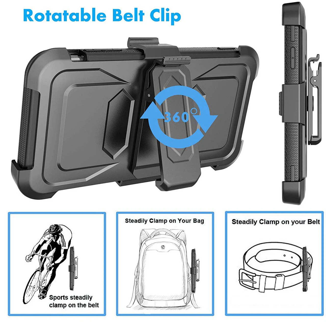 - belt holster with a rotating belt clip that doubles as a stand, kickstand for hands free viewing