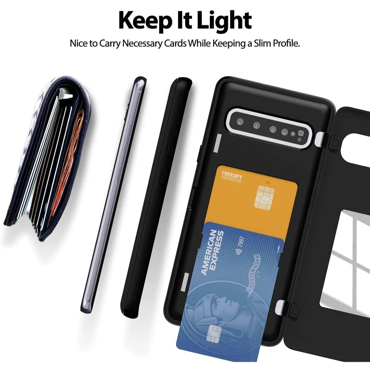 - The pocket friendly lightweight slim Galaxy S10 5G Card Holder Case offers precise cutouts and allow easy access to all buttons and ports. Fits snugly over the volume buttons, side button, and curves of the phone.