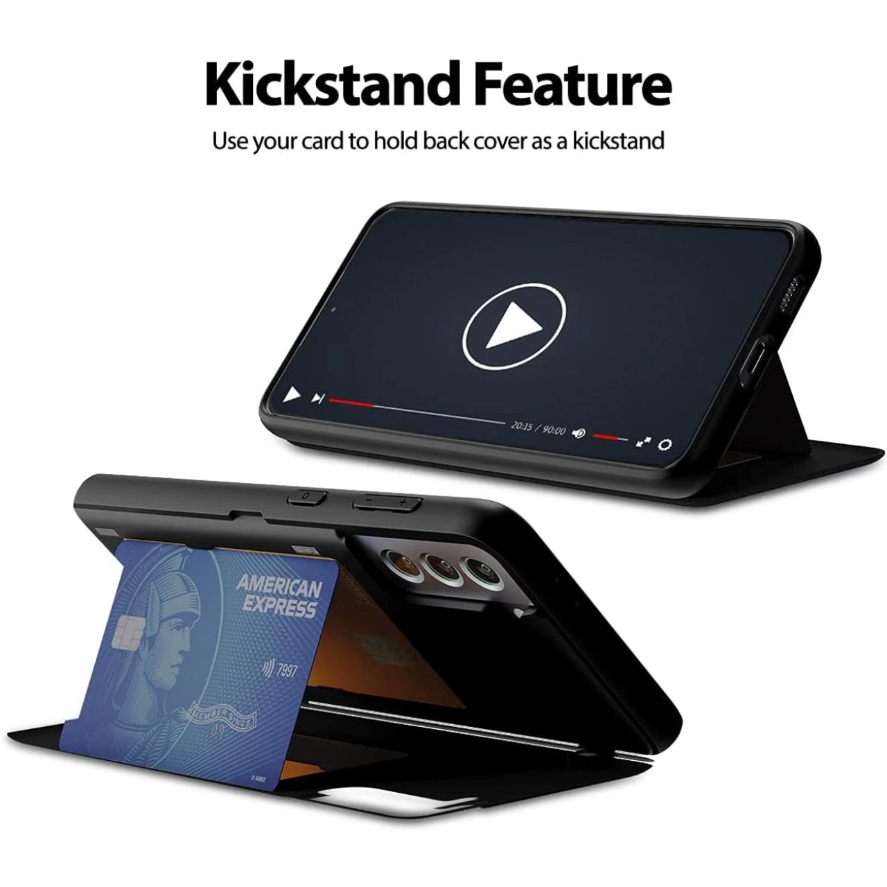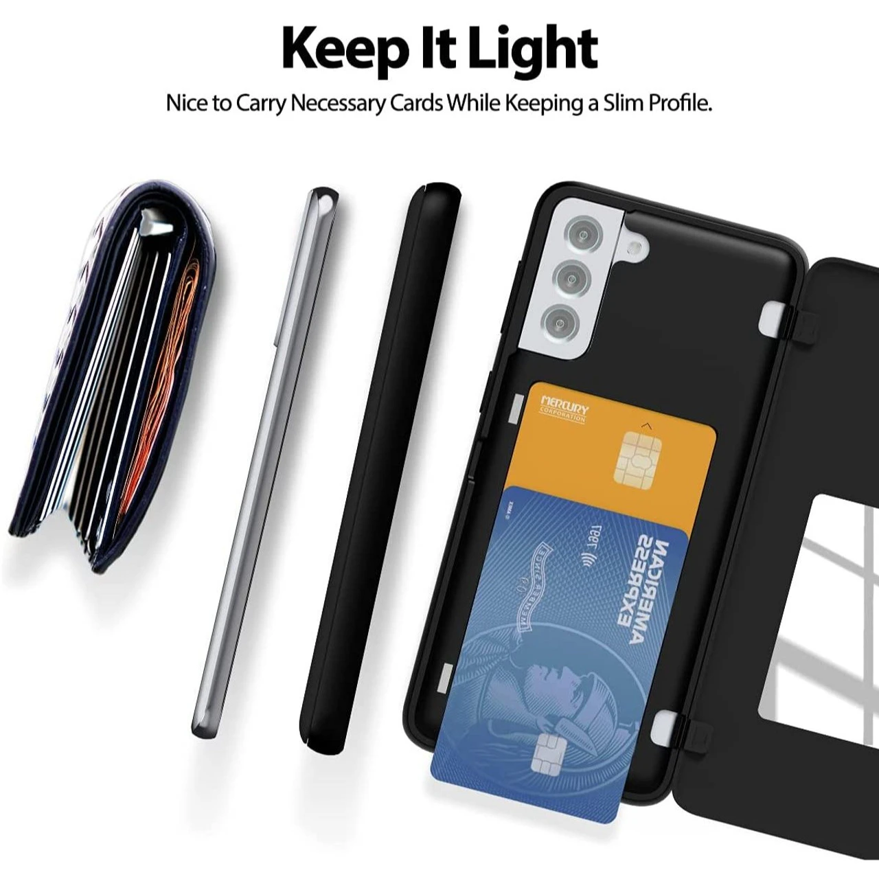 - The pocket friendly lightweight slim Galaxy S21 + Plus Card Holder Case offers precise cutouts and allow easy access to all buttons and ports. Fits snugly over the volume buttons, side button, and curves of the phone.