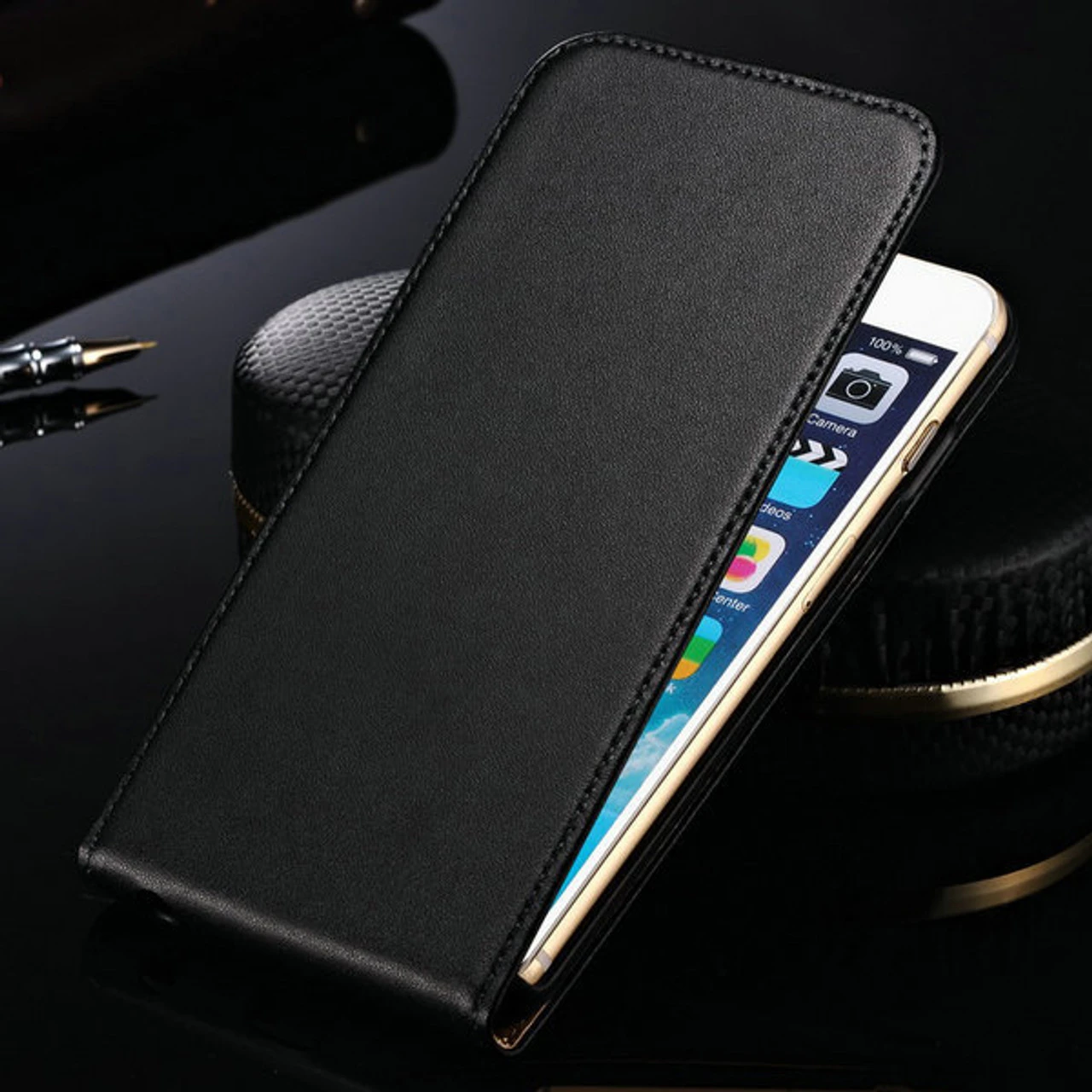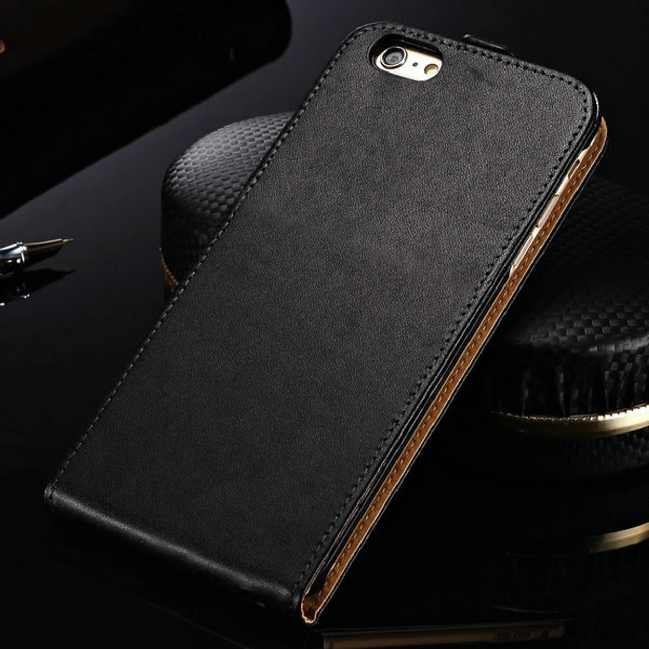 -    1 x Black Genuine Leather Flip Case For Apple iPhone 6 / 6S Phone Cover