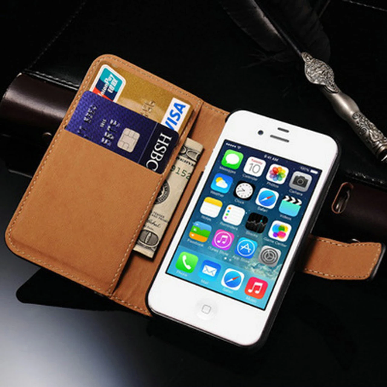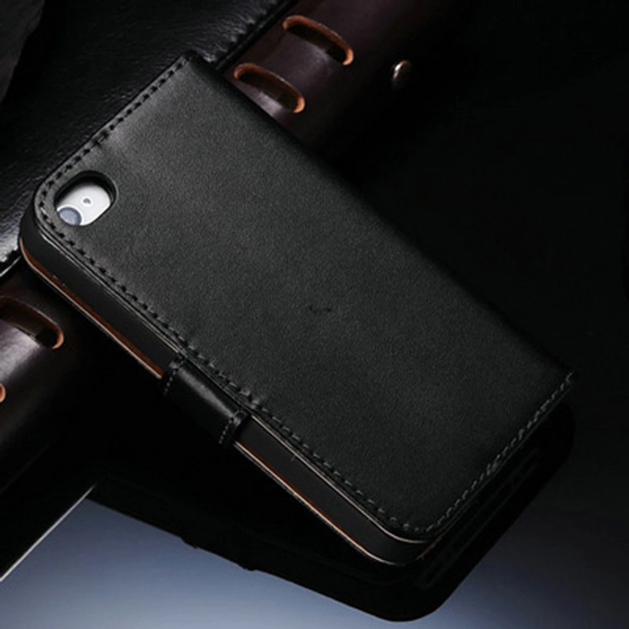- 1 x Black Genuine Leather Wallet Case for Apple iPhone 4 / 4S