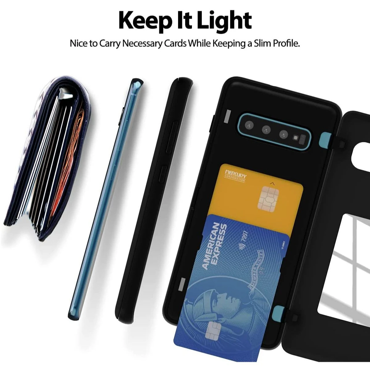 - The pocket friendly lightweight slim Galaxy S10 + Plus Card Holder Case offers precise cutouts and allow easy access to all buttons and ports. Fits snugly over the volume buttons, side button, and curves of the phone.