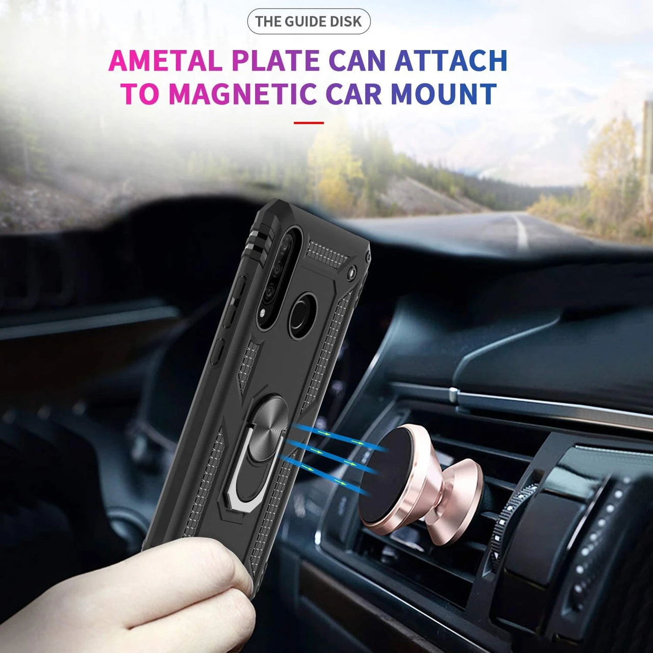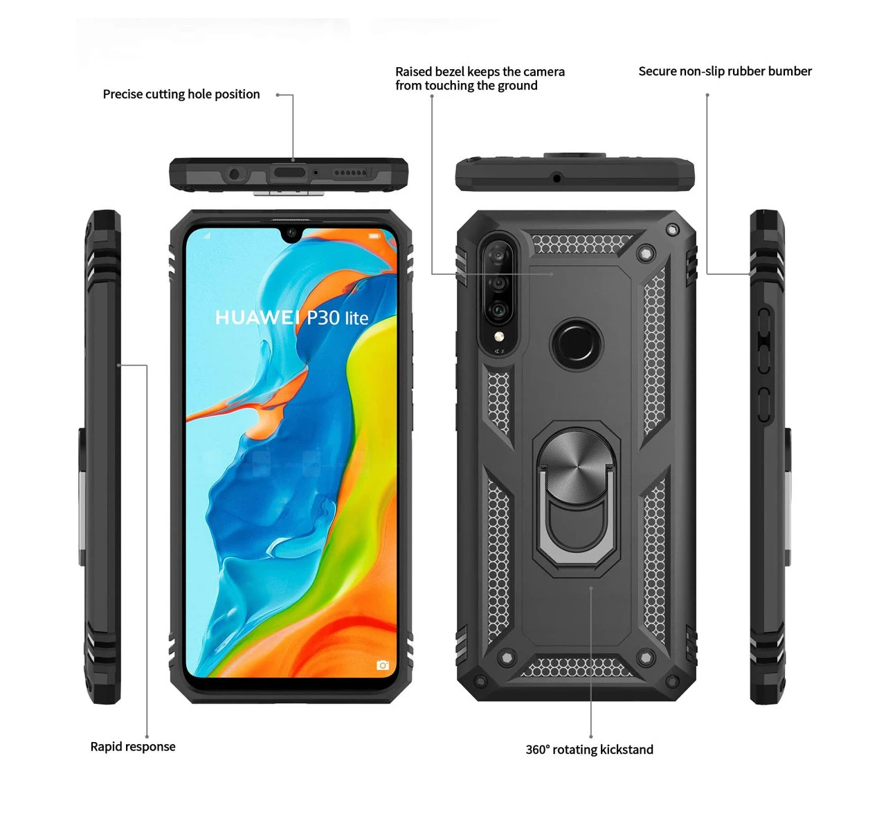 - 1 x Black Huawei P30 Lite Slim Armour 360 Rotating Metal Ring Stand Case