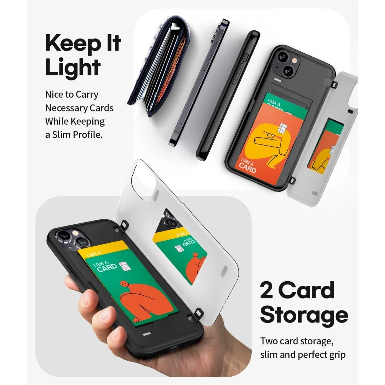 - The card storage part is designed with a curve, so you can store 2 cards from bottom to top more easily.