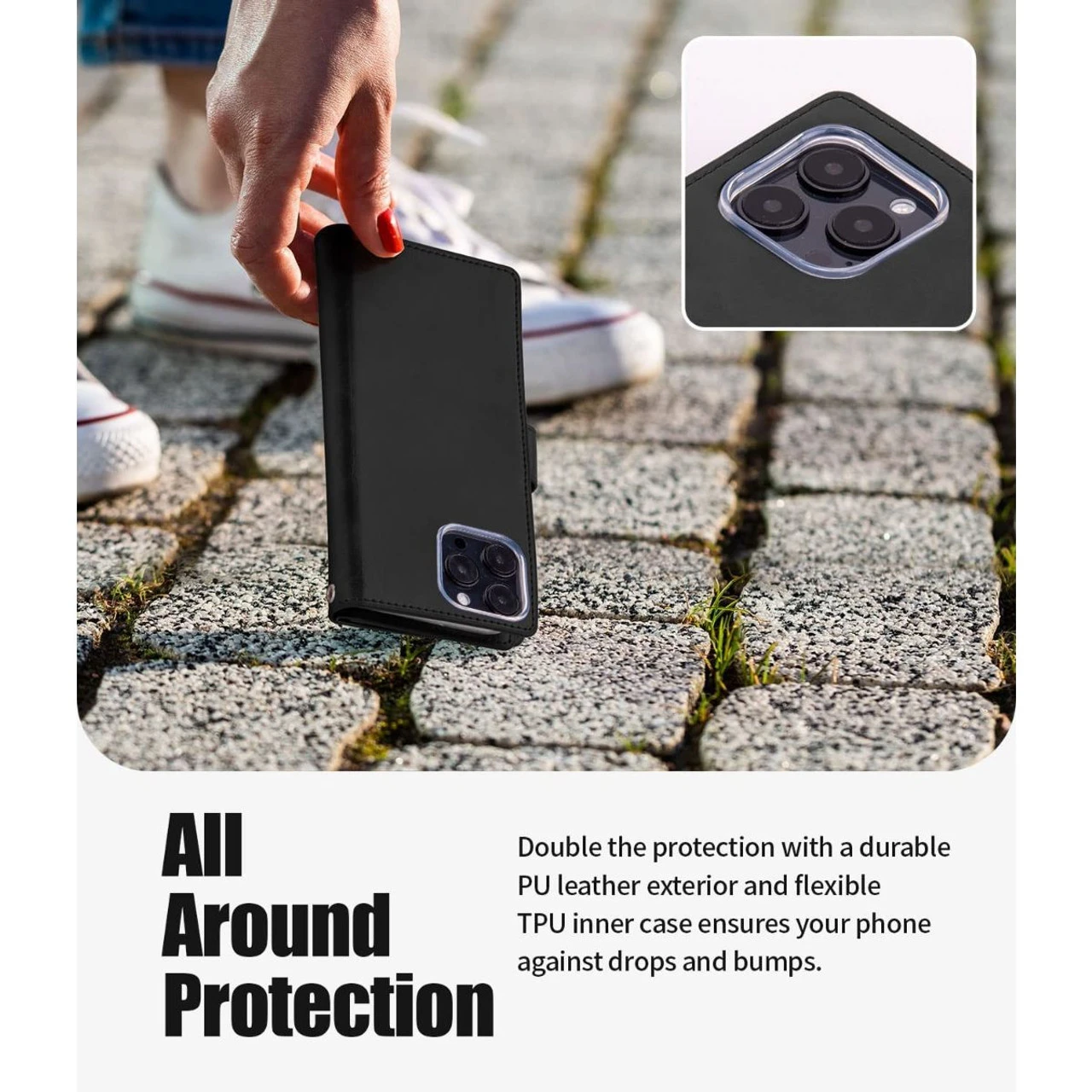 Double the protection with a durable PU leather exterior and flexible TPU inner case ensures your phone against drops and bumps. The inner case with raised lip technology protects the screen and rear camera against scratches while safely lift from flat surfaces.