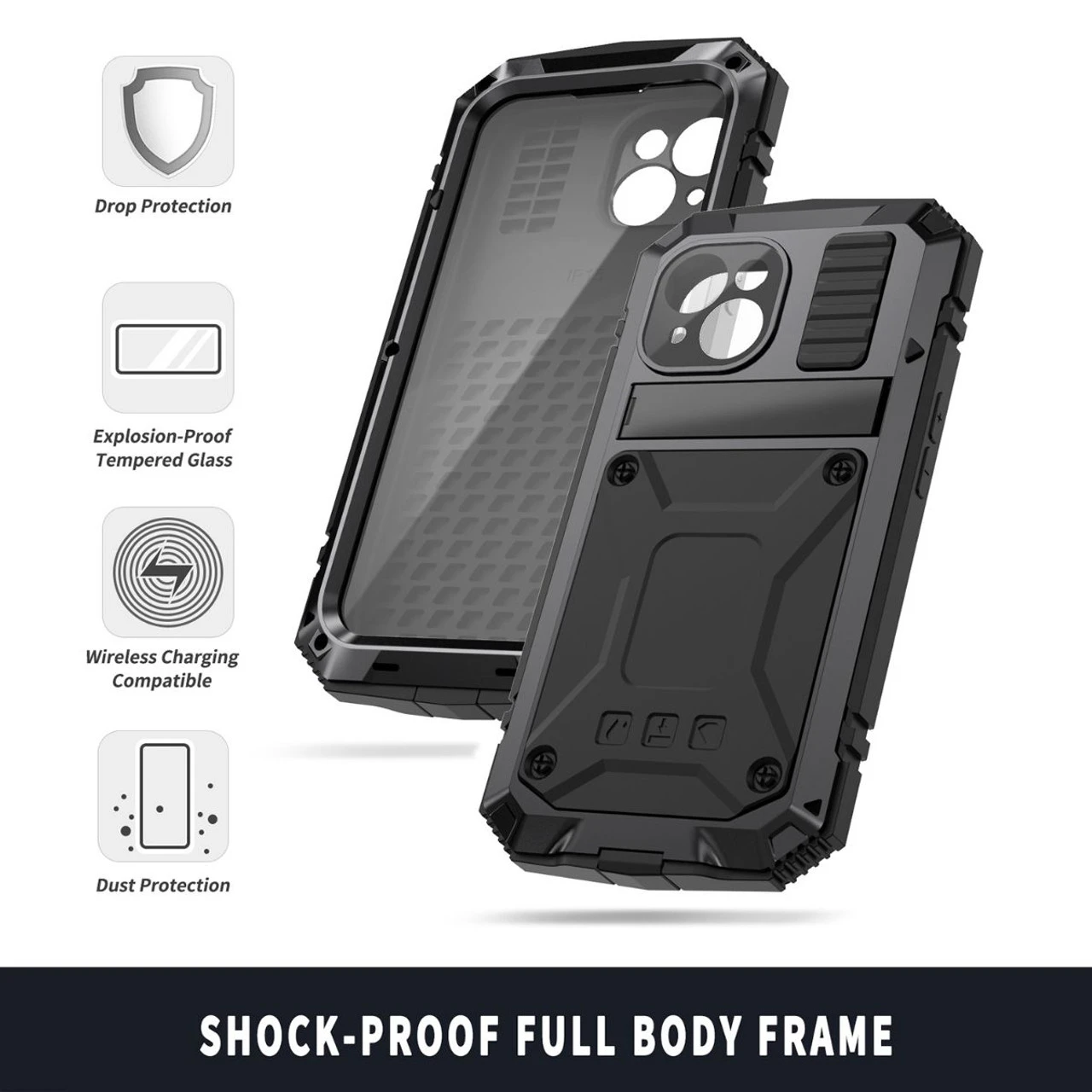 - Â Â Â 1 x Black iPhone 15 Full Body Metal Case Built-In Screen Protector