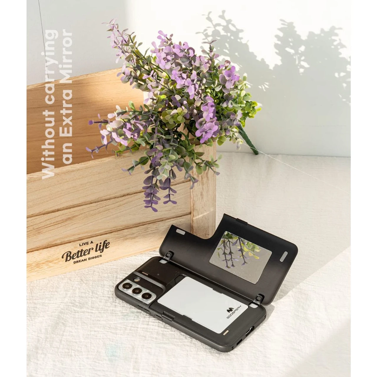 - In addition, attachable hidden mirror inside is designed specially for quick etiquette checks. (Please remove the scratch resistant film before use.) Getting ready to go out is easier than ever.