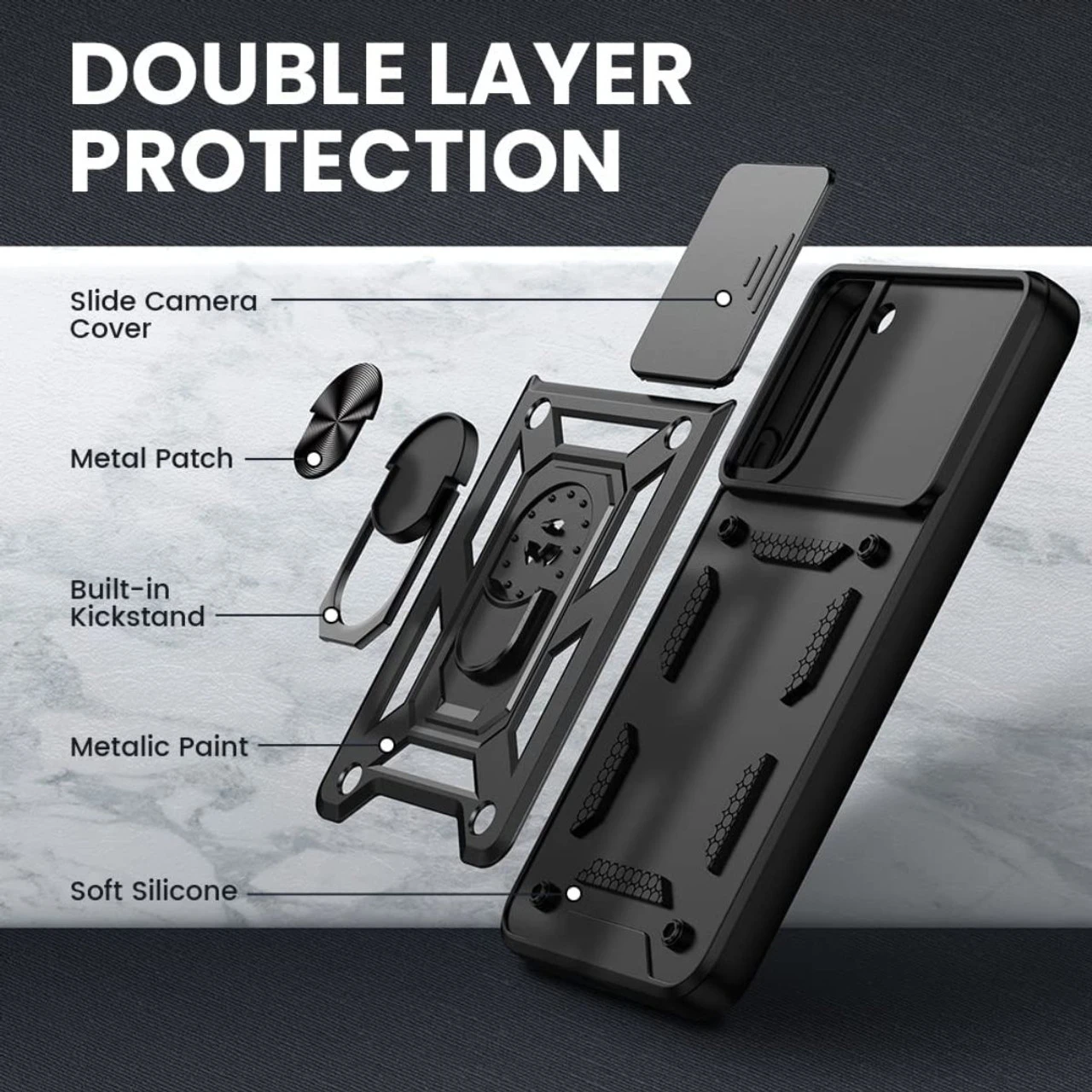 - Â Â Â 1 x Black Samsung Galaxy S22 Slim Armour 360 Degree Ring Camera Guard Case