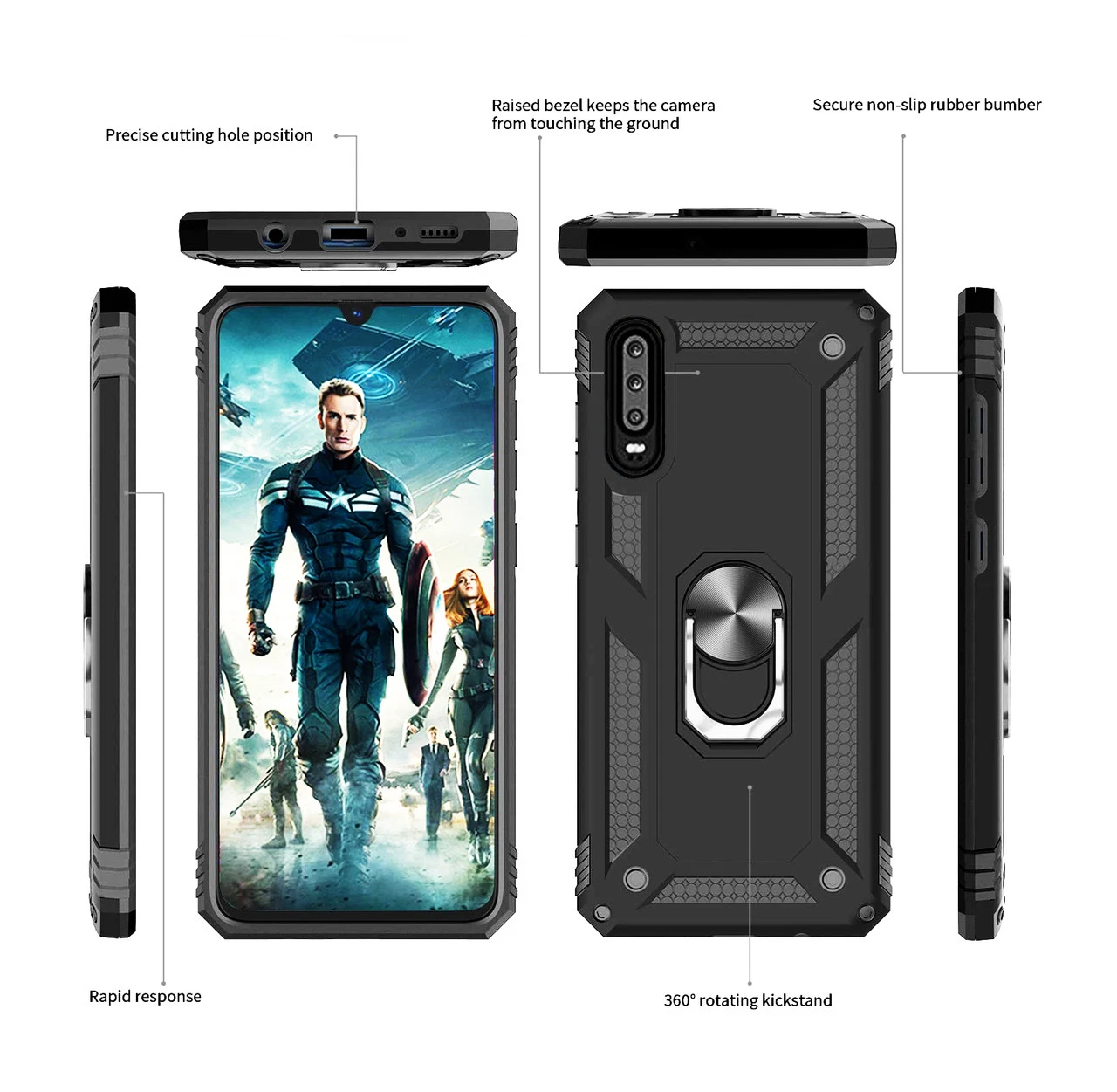 - 1 x Black Slim Armour 360 Rotating Metal Ring Stand Case For Huawei P30Â