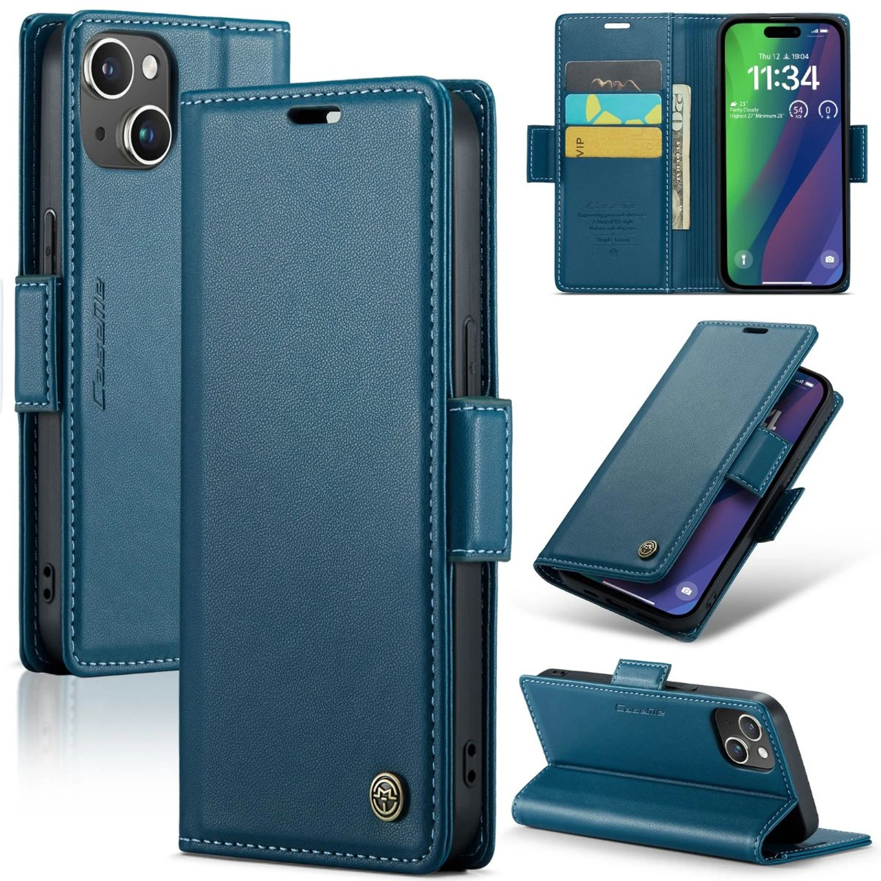 Blue Genuine CaseMe Litchi Textured Wallet Case For iPhone 15