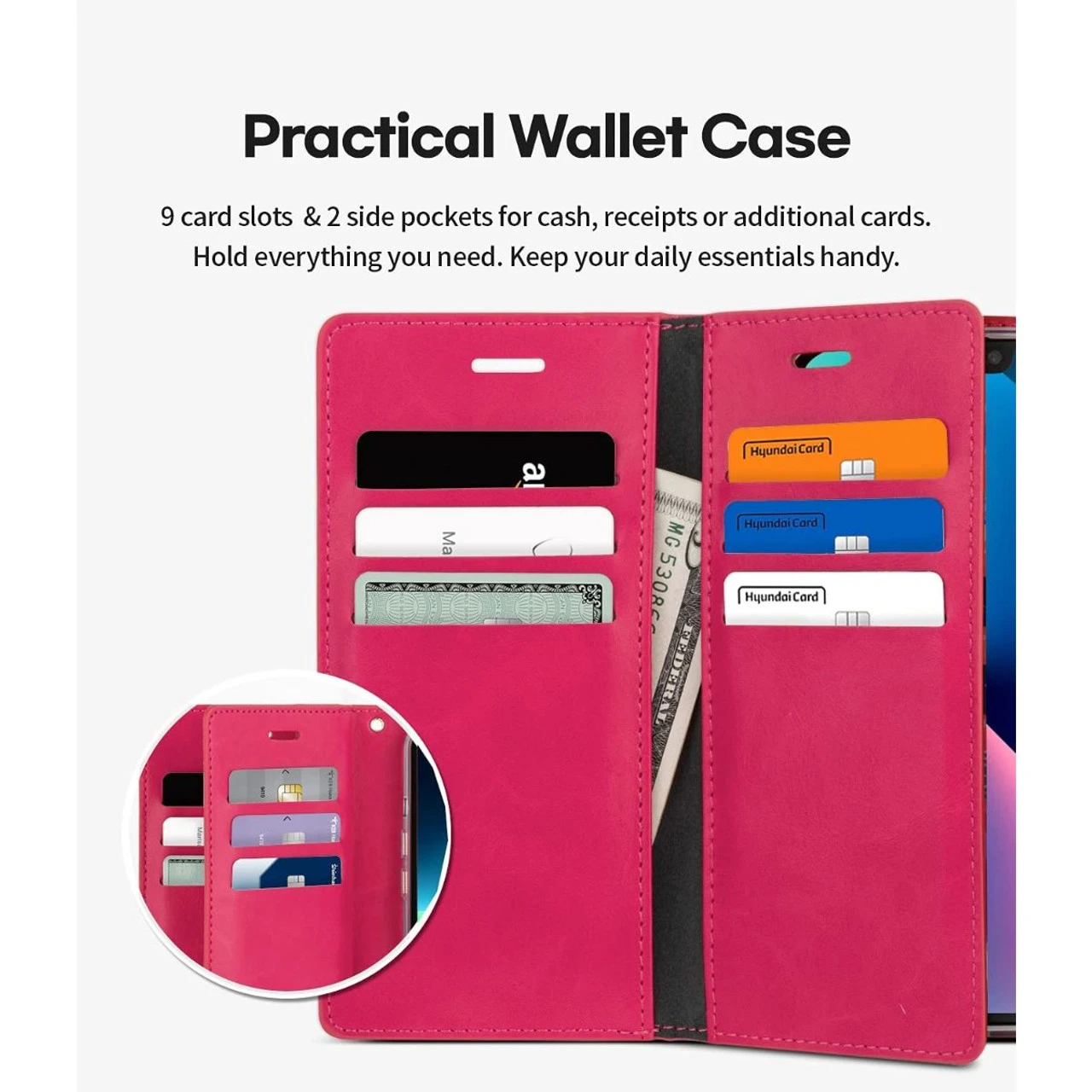 Practical iPhone 13 Pro pink wallet case that is compatible with Apple iPhone 13 Pro. It provides 9 card slots & 2 side pockets for cash, receipts or additional cards. Keep your daily essentials handy.