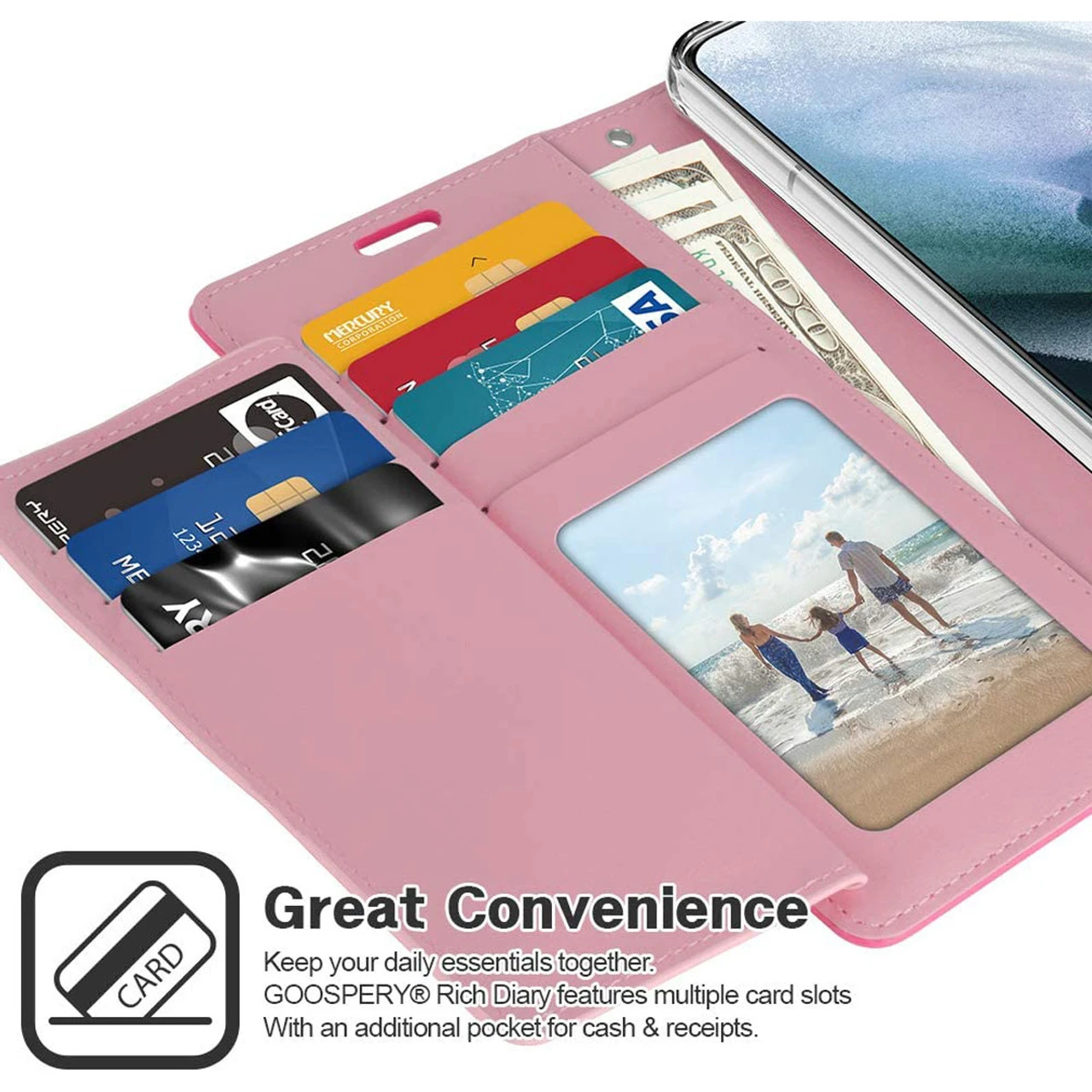 Our Rich Diary holds the most credit/ID cards compared to other diary type cases out there. Its extra folding flap provides privacy for the windowed ID card slot and there is an additional pocket for bills/receipts to eliminate the need for a separate wallet.
