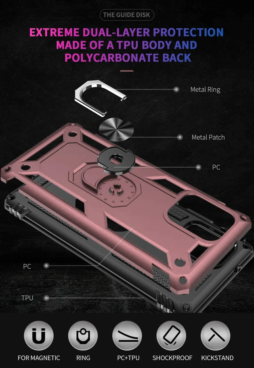 360 Degree Rotating Hidden Built-in ring Rotatable Kickstand provides more angles for watching a video, conferences, and class presentations. More convenient and hands-free. No need to buy finger ring holder anymore!