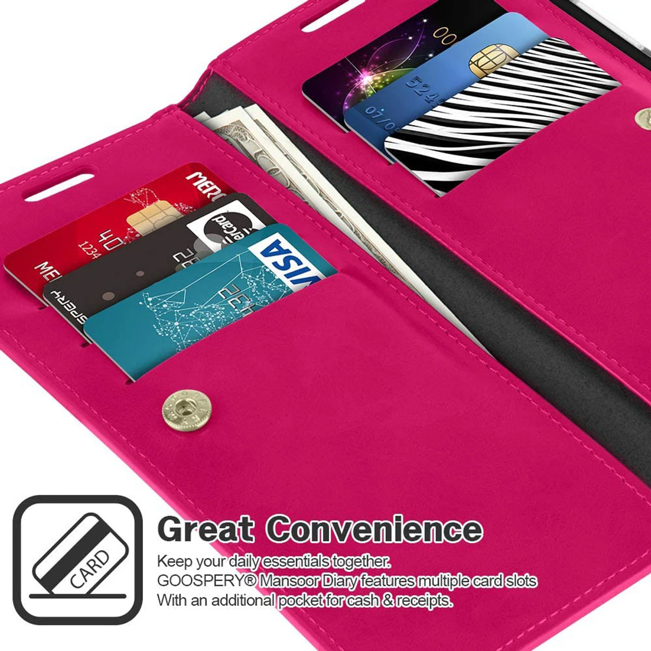 Designed with an attached center flap to provide more compartments for credit/ID cards and cash compared to other diary type cases out there, eliminating the need to carry a separate wallet